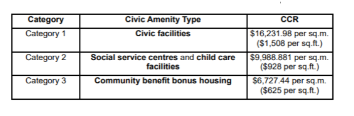 On October 28, Council adopted amendments on the Community Benefit Bonus and Capital Cost Rates. The Rates are proposed to establish the value and size of community benefit bonus housing and amenities under the new density bonus provisions.ย ย