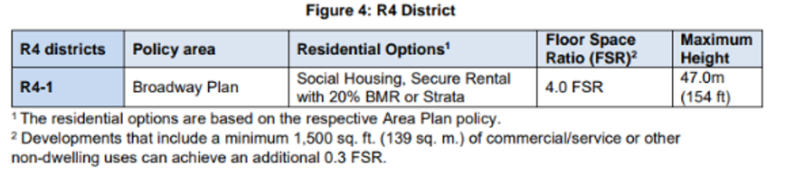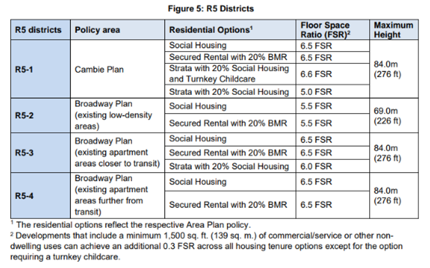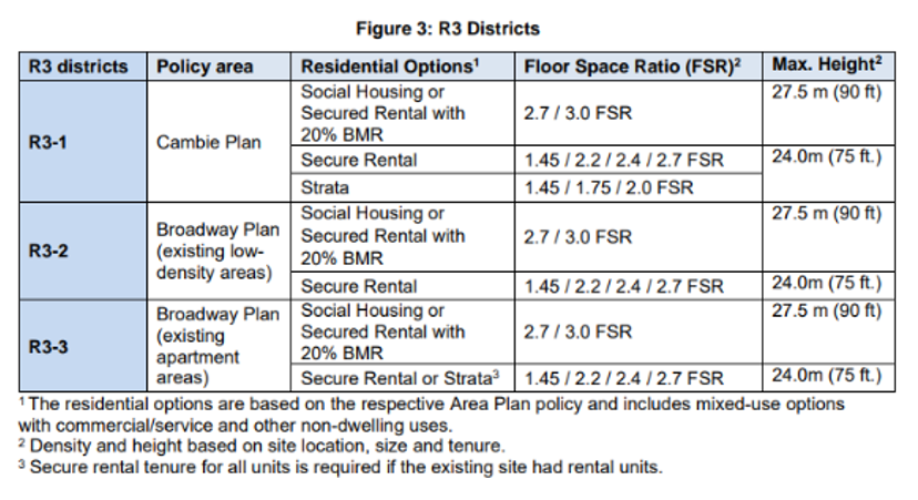 The new R3, R4, and R5 zoning districts retain maximum floor space ratios (FSRs) but allow more flexible building heights. Affordable housing requirements are now consolidated into a new Schedule J, introduced under Bill 16. Schedule J standardizes inclusionary zoning, density bonusing, and legal requirements for affordable housing across all new district schedules.